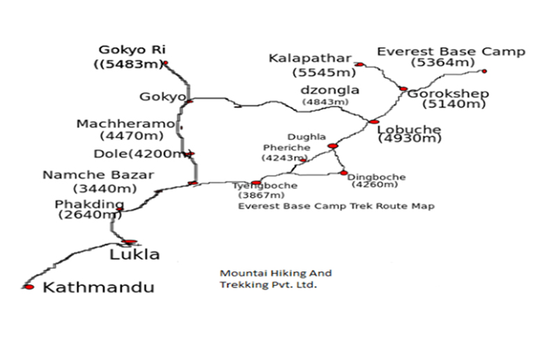 The trek started from the town of Lukla, which is 2,860 meters above sea level in a temperate zone. It ended at Everest base camp, which stands 5,364 meters above sea level in a very cold mountainous zone.